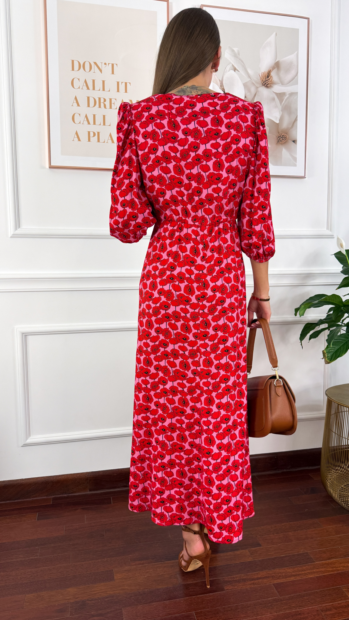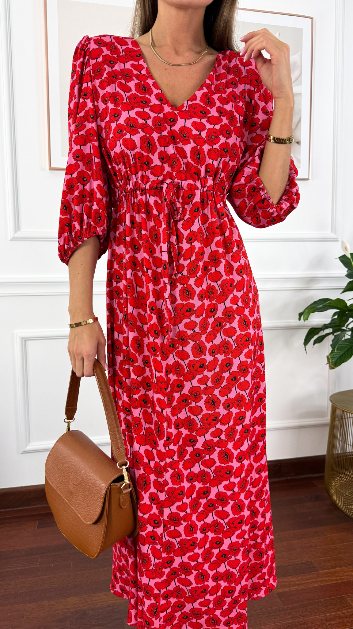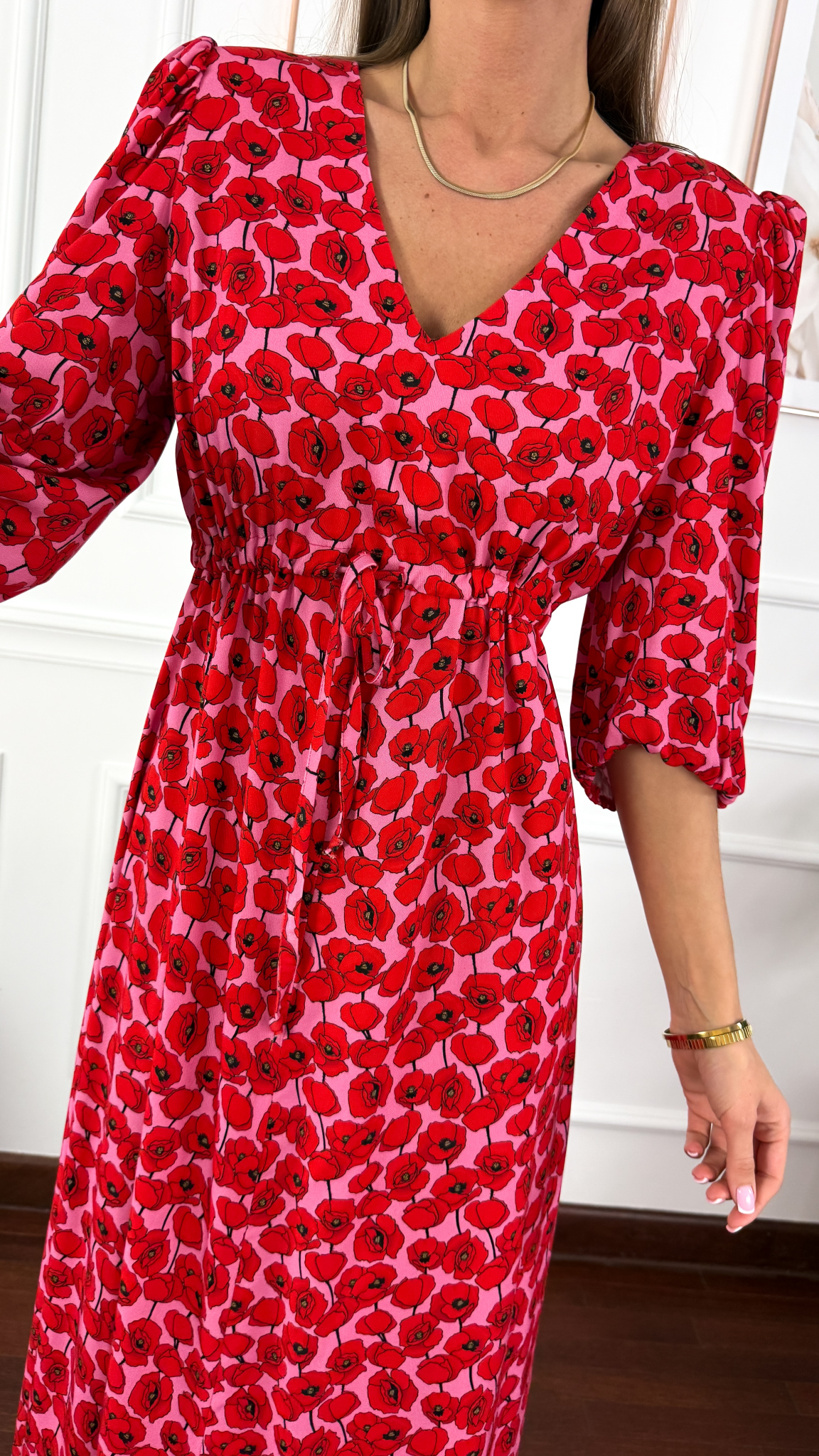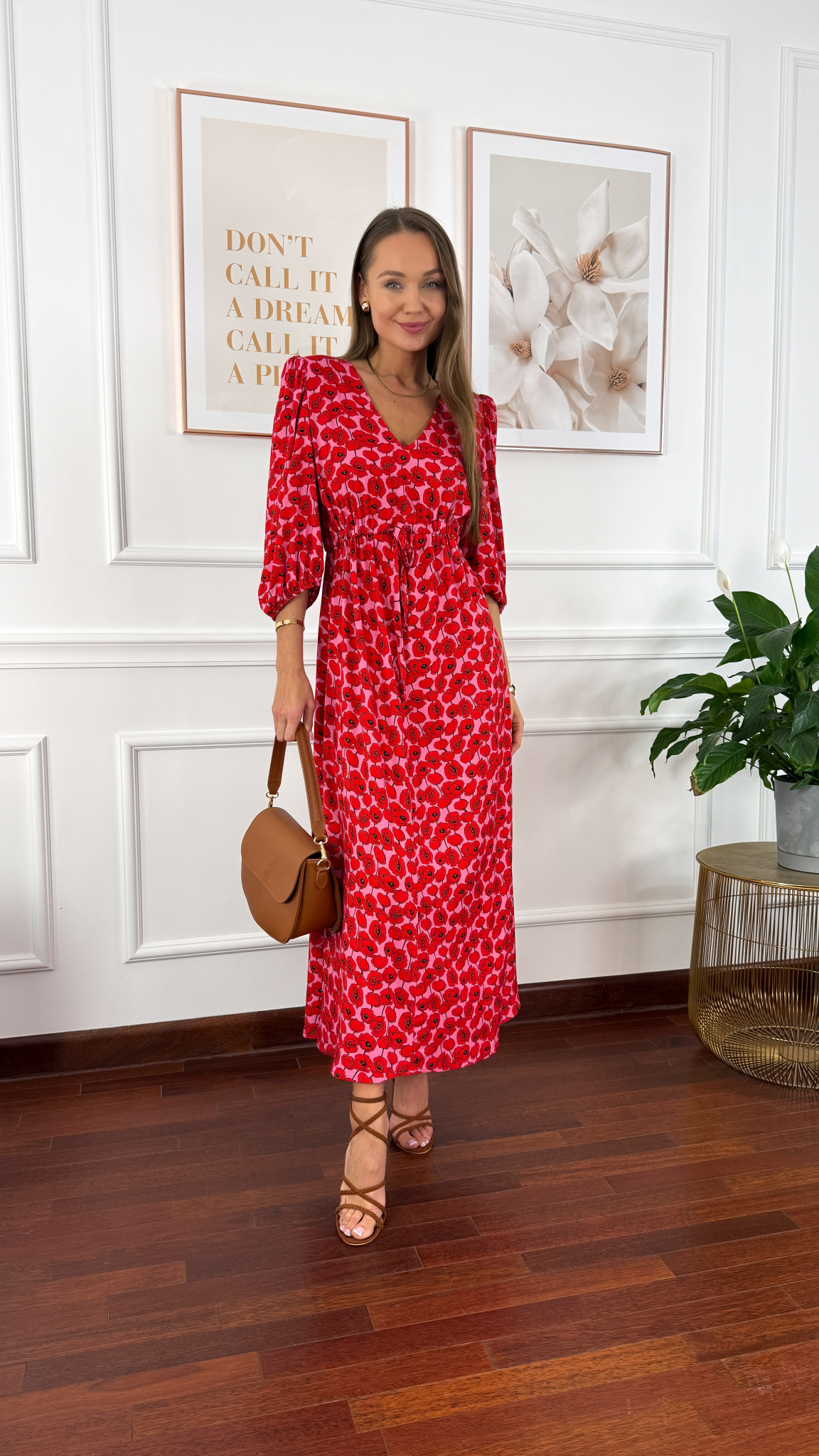 Wiskozowa sukienka maxi. W ramionach wszyto poduszki. Dekolt w serek oraz rękaw zakończonym gumką. W talii wszyto troczek.