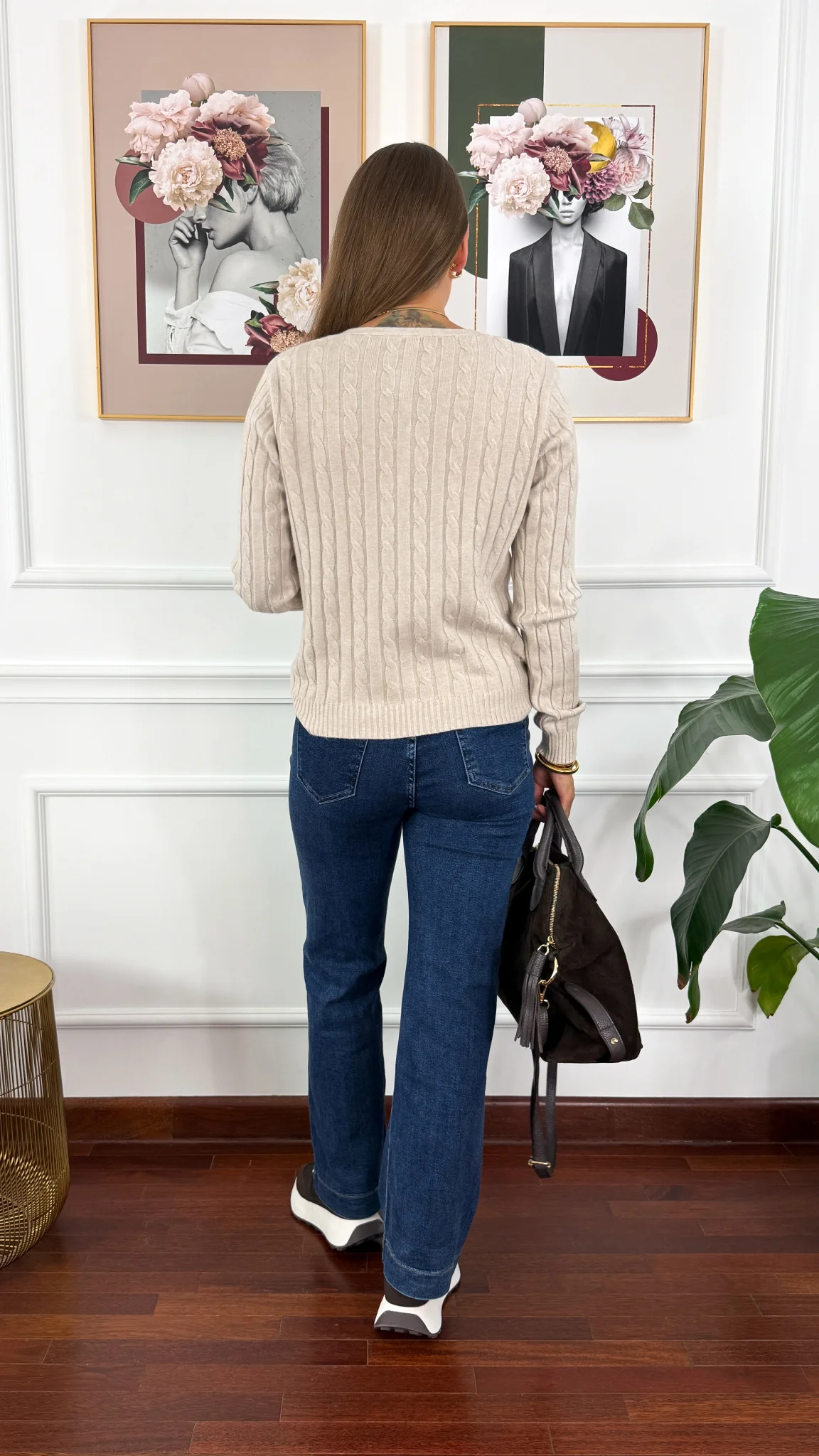 Model sprawdzi się na sylwetkę w rozmiarze od S do L. Kardigan zapinany na guziki z dekoltem w kształcie litery V. Rękawy oraz dół zakończone ściągaczem.