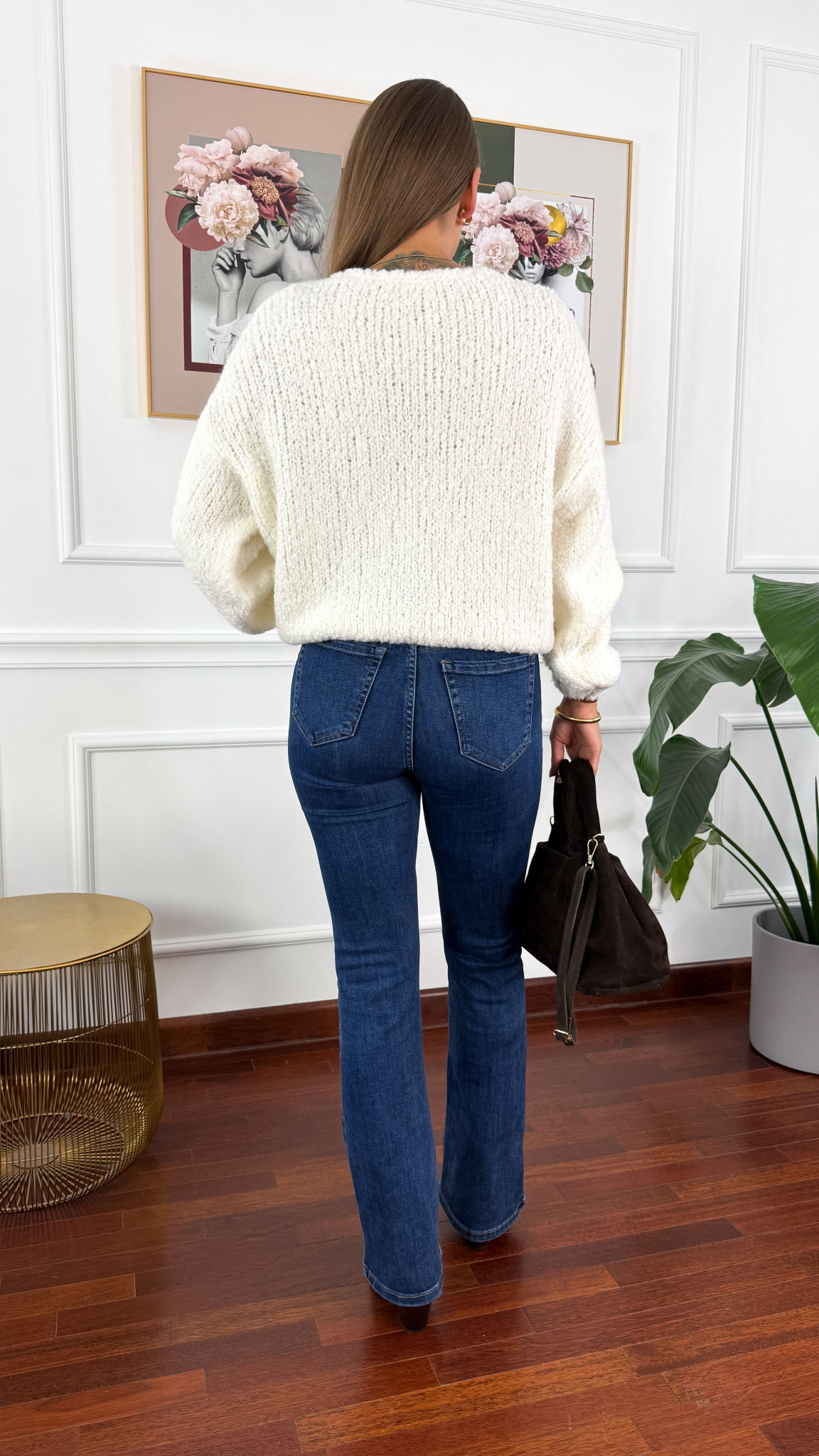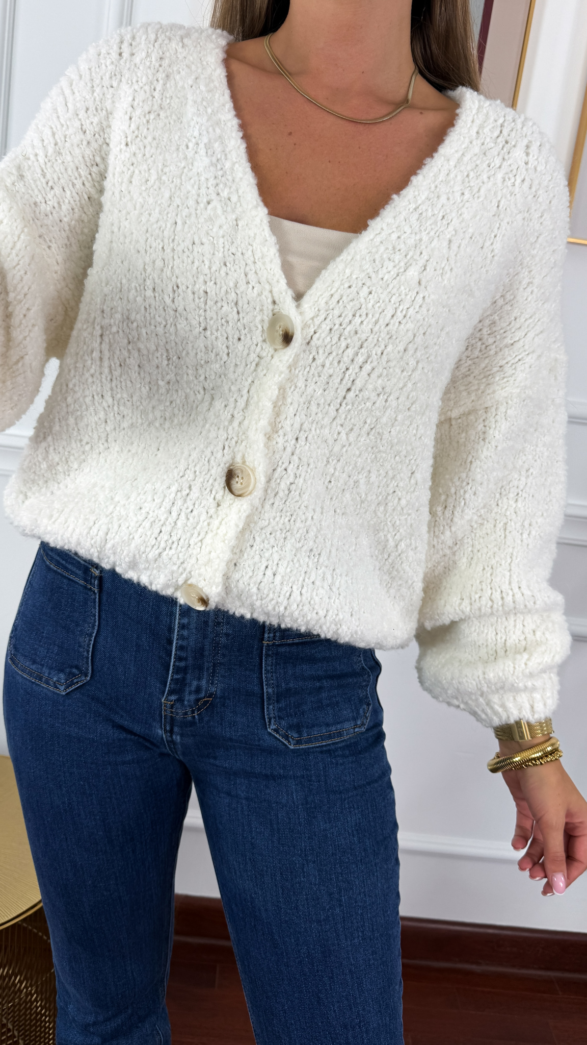 Model sprawdzi się na sylwetkę w rozmiarze od S do L. Dzianinowy sweter zapinany na guziki. Kardigan jest przyjemny w dotyku.