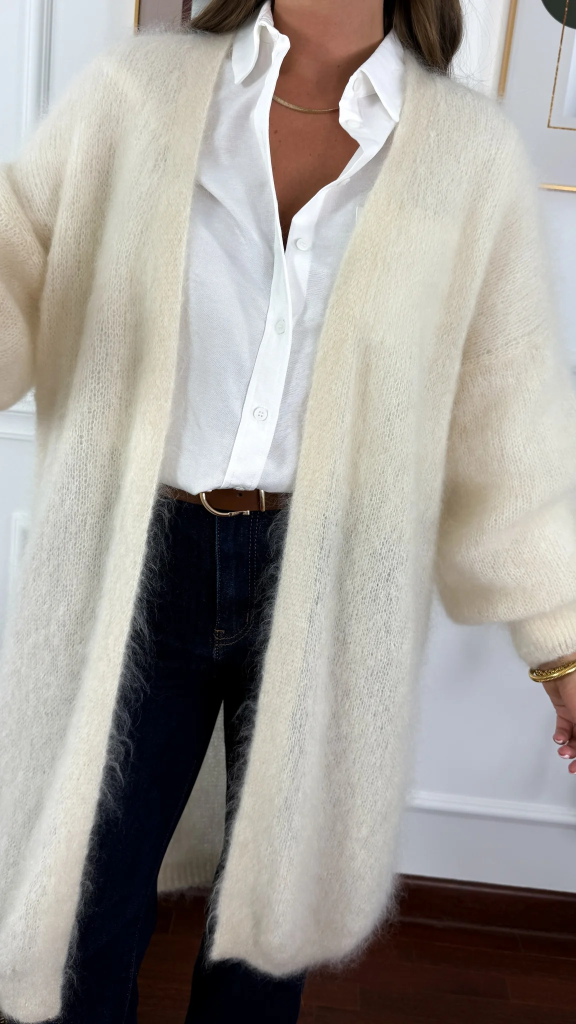 Model sprawdzi się na sylwetkę od S do L. Moherowy długi kardigan. Przez naturalny skład, sweter jest bardzo ciepły, a jednocześnie lekki. Jakość premium.
