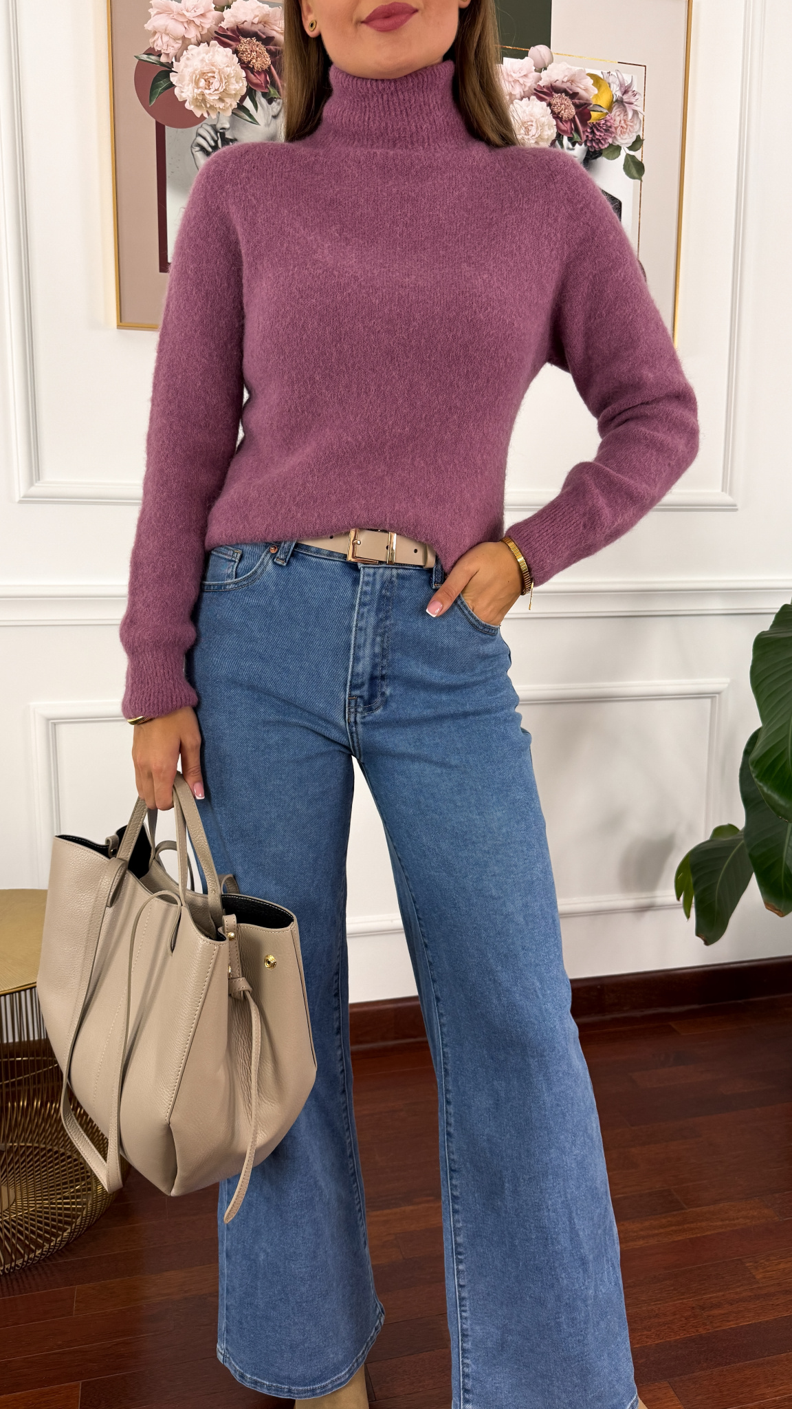 Golf sprawdzi się na sylwetkę w rozmiarze od S do L. Na dole oraz zakończeniu rękawów posiada ściągacz. Sweter delikatnie wyczuwalny.