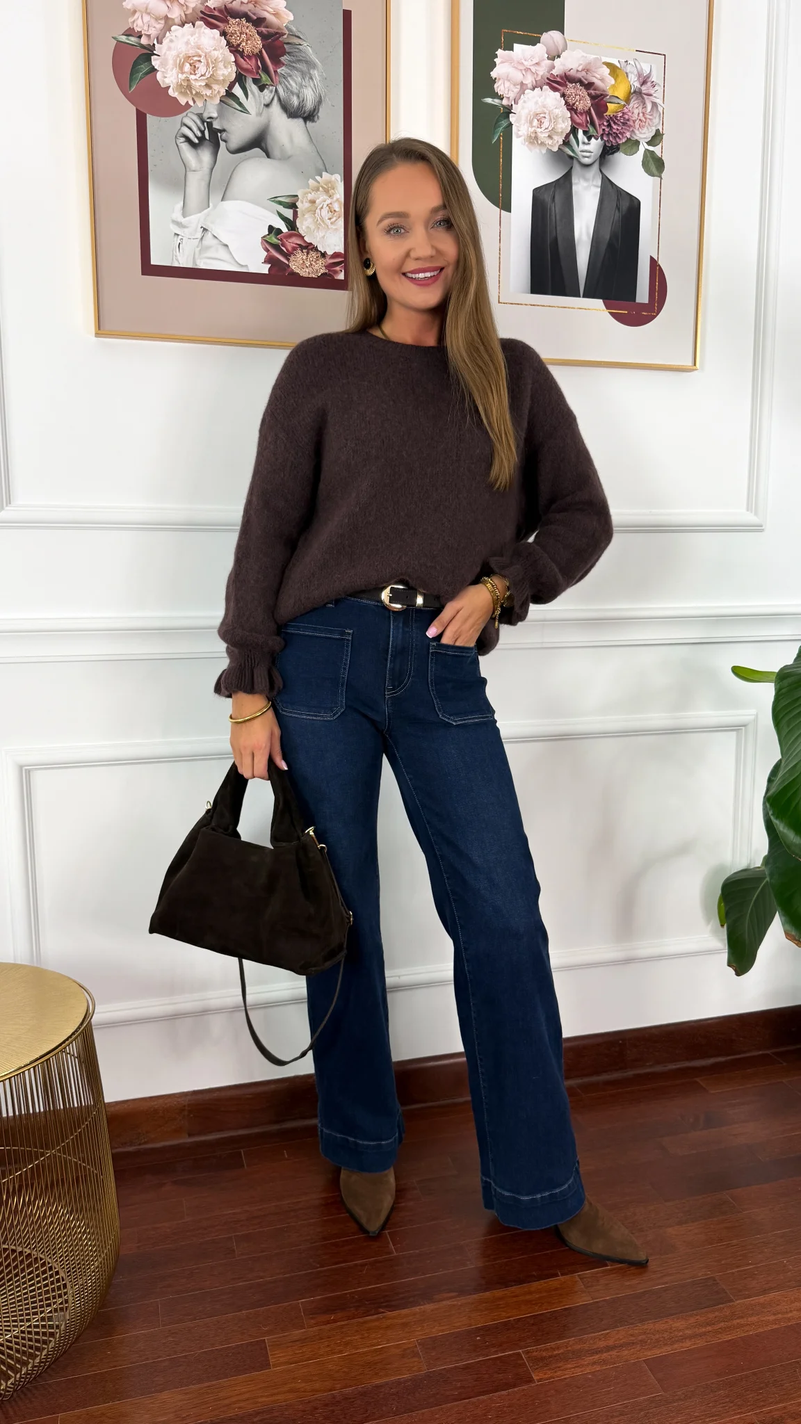 Model sprawdzi się na sylwetkę od S do XL. Alpakowy kardigan. Rękawki zakończone falbanką. Sweter jest niezwykle przyjemny w dotyku.