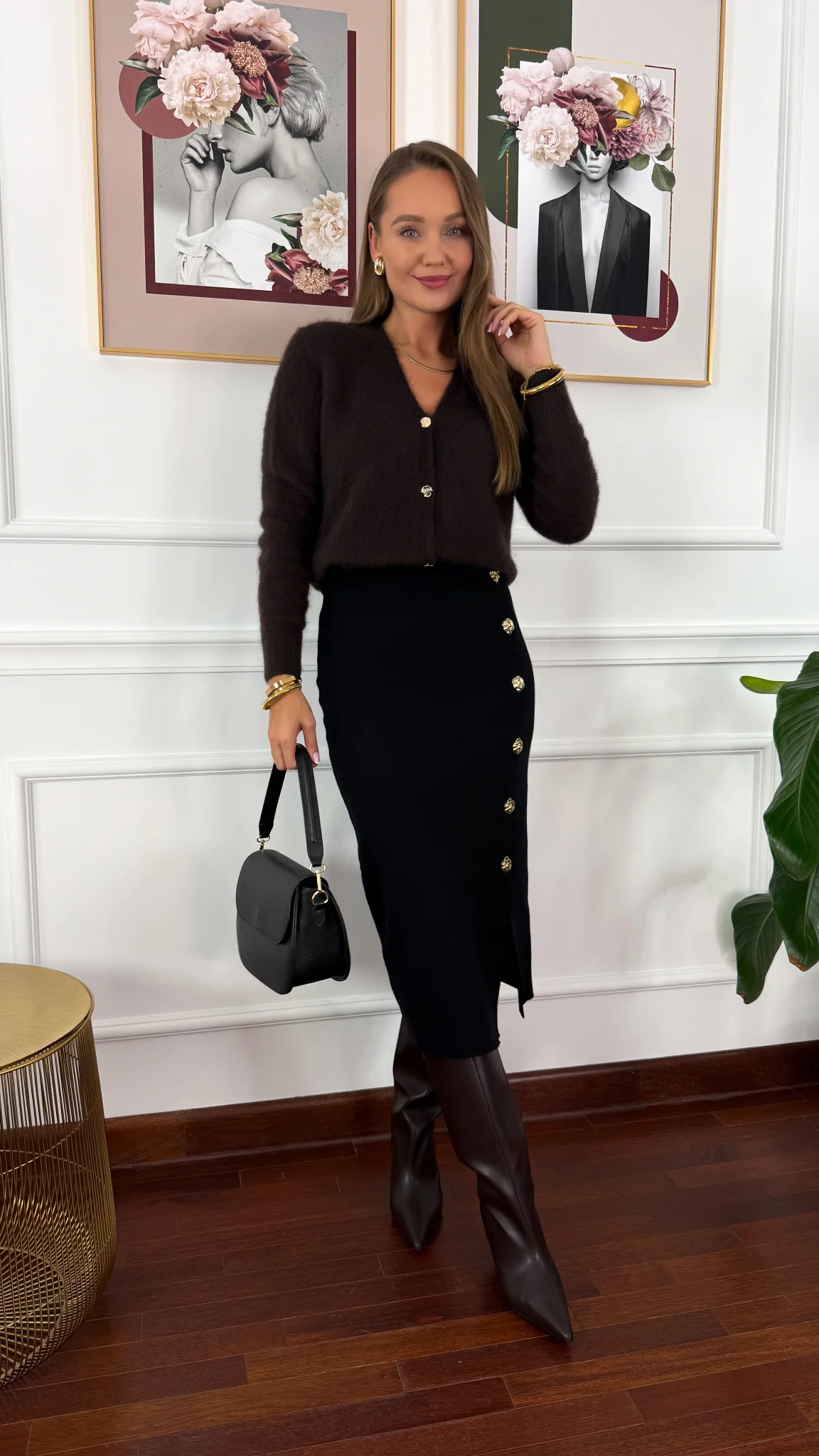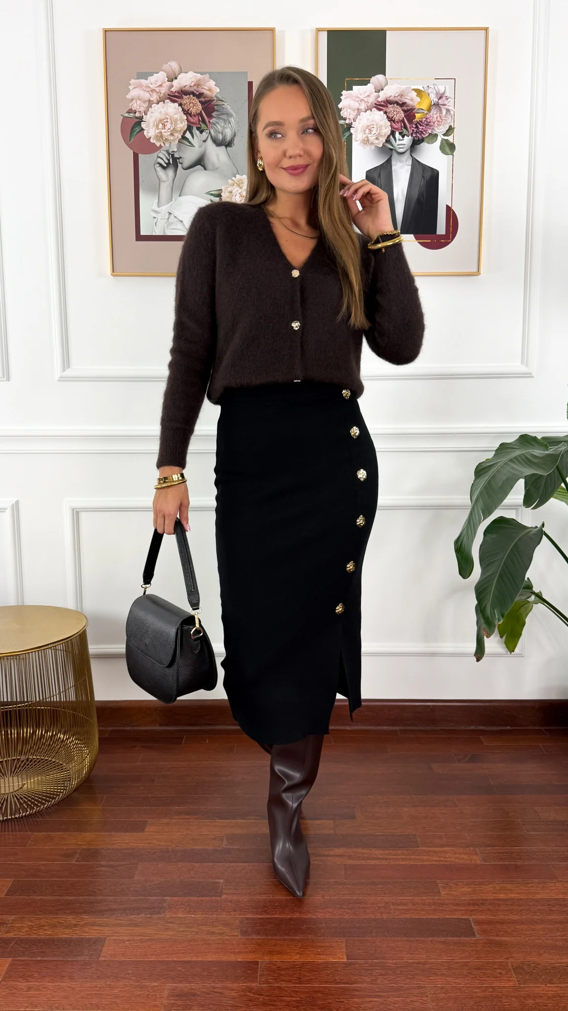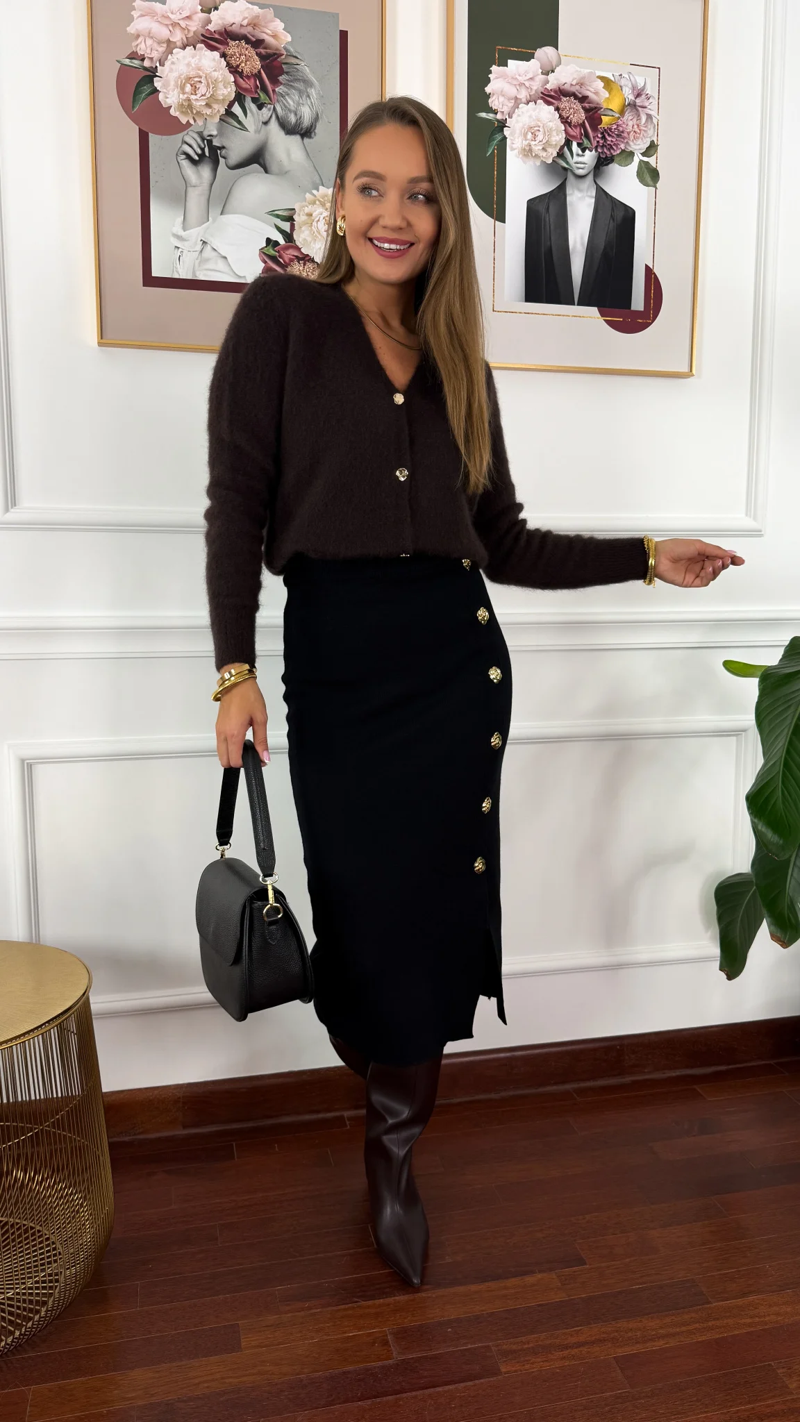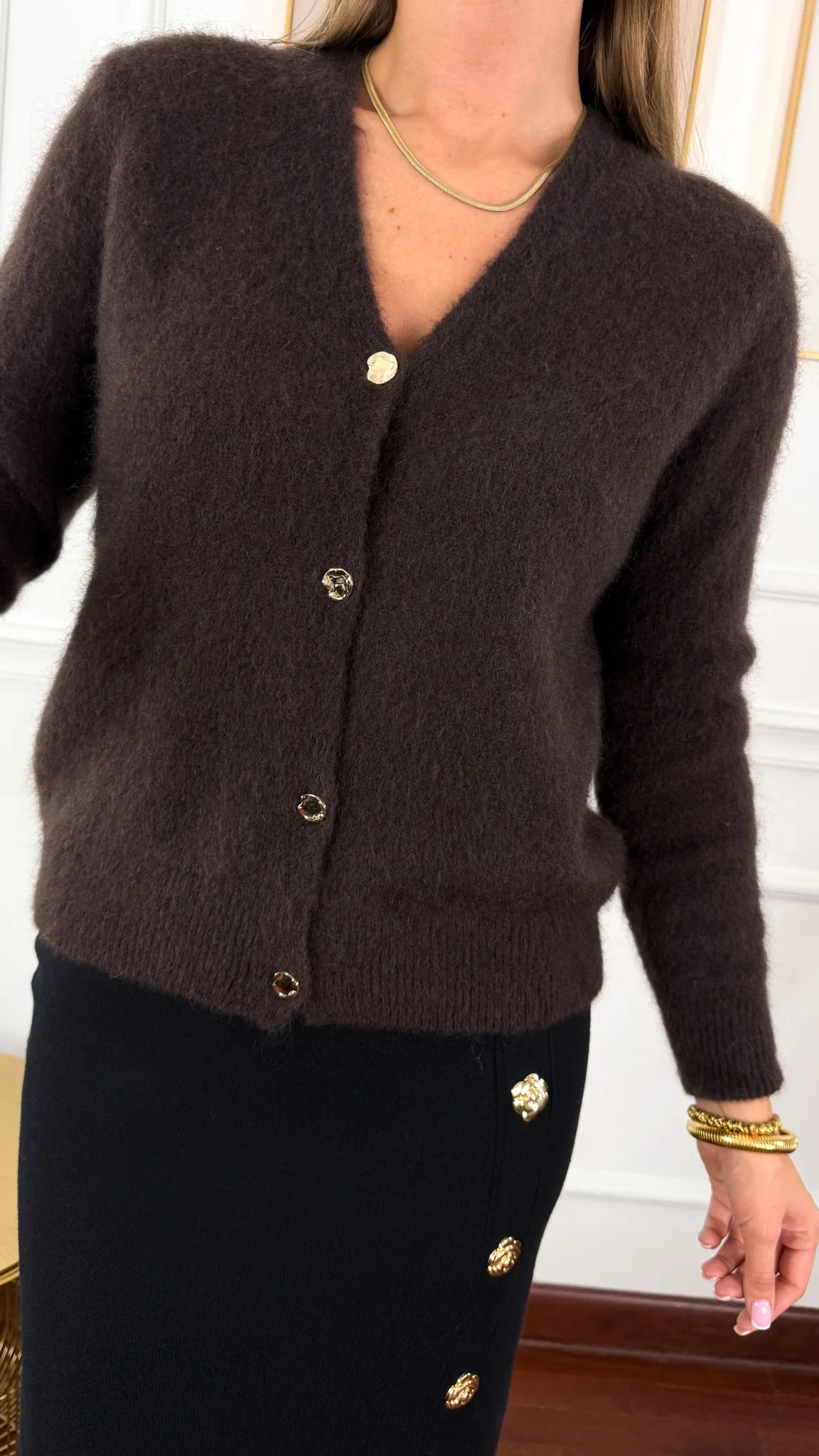Model sprawdzi się na sylwetkę od XS do M. Wełniano-moherowy kardigan. Dół oraz rękawy zakończone ściagaczem. Ozdobne guziki. Sweter jest delikatnie wyczywalny.