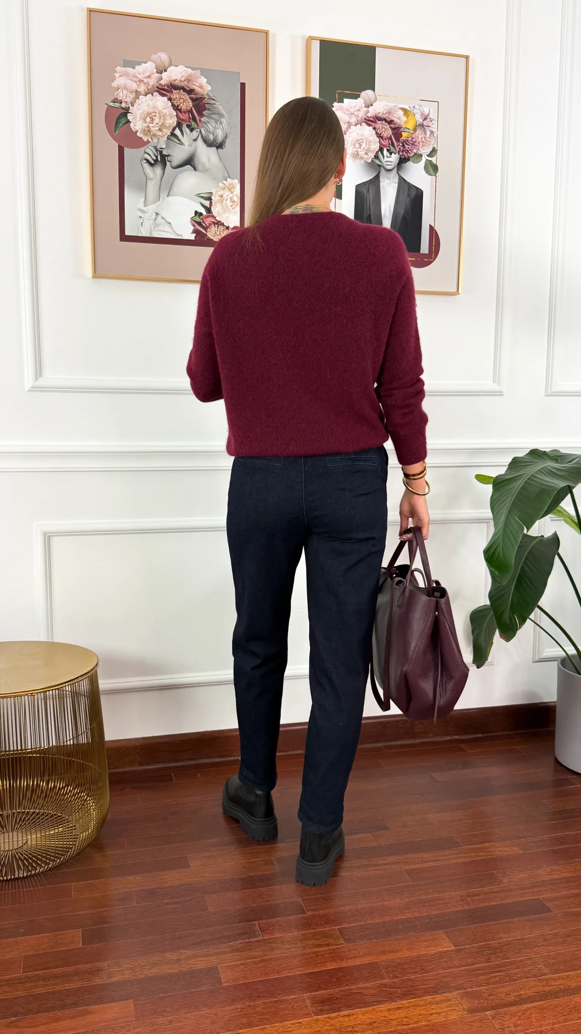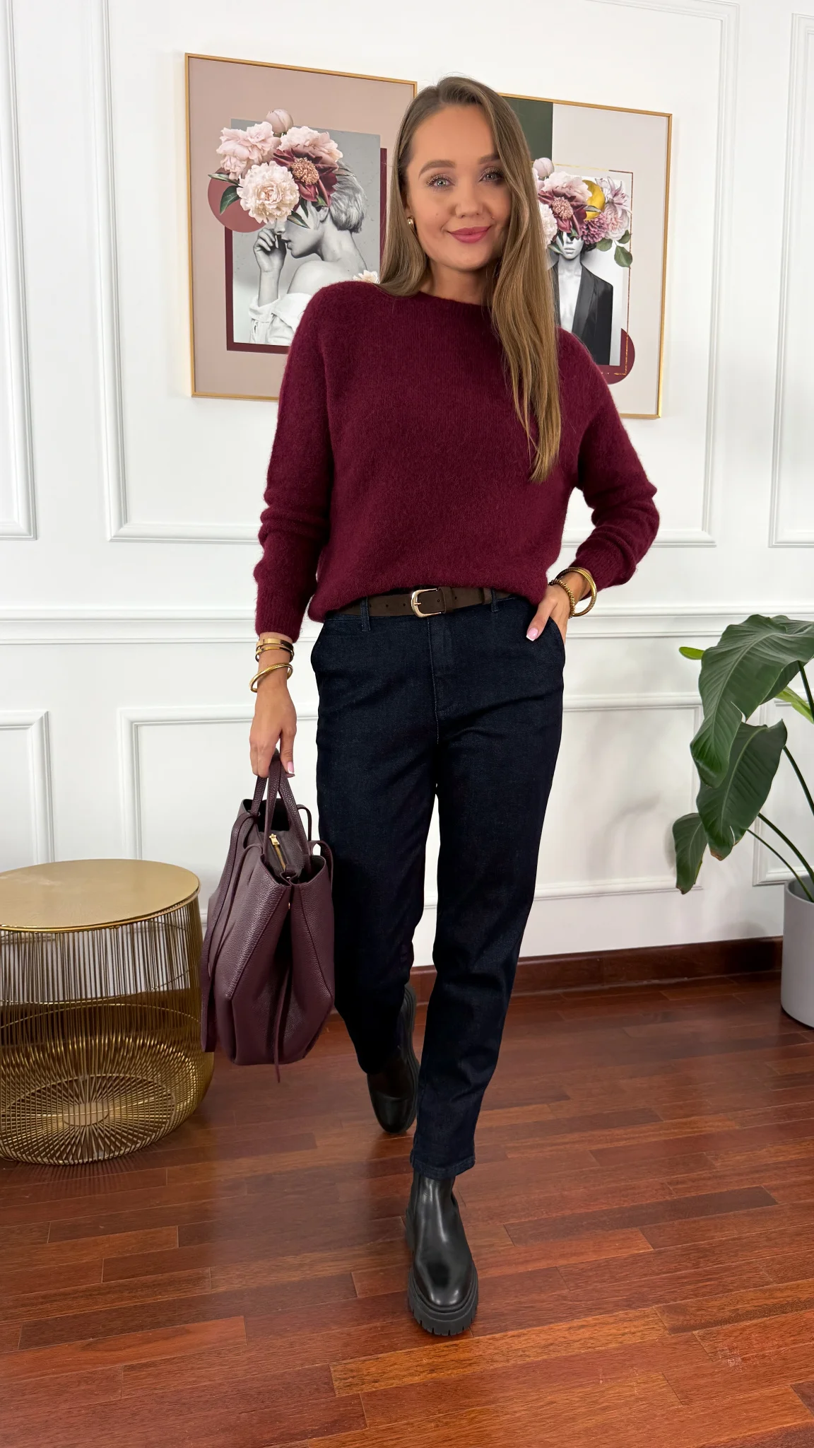 Model sprawdzi się na sylwetkę od XS do L. Dzianinowy sweter na długi rękaw z okrągłym dekoltem. Dół swetra oraz rękawki zakończone są ściągaczem. Sweter jest niezwykle przyjemny w dotyku.