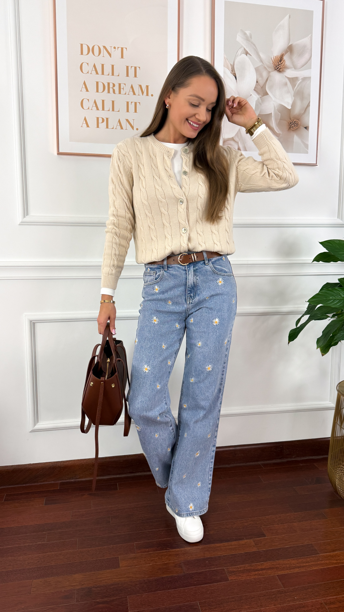 Model sprawdzi się na sylwetkę w rozmiarze od S do L. Kardigan zapinany na guziki z okrągłym dekoltem. Rękawy oraz dół zakończone ściągaczem.