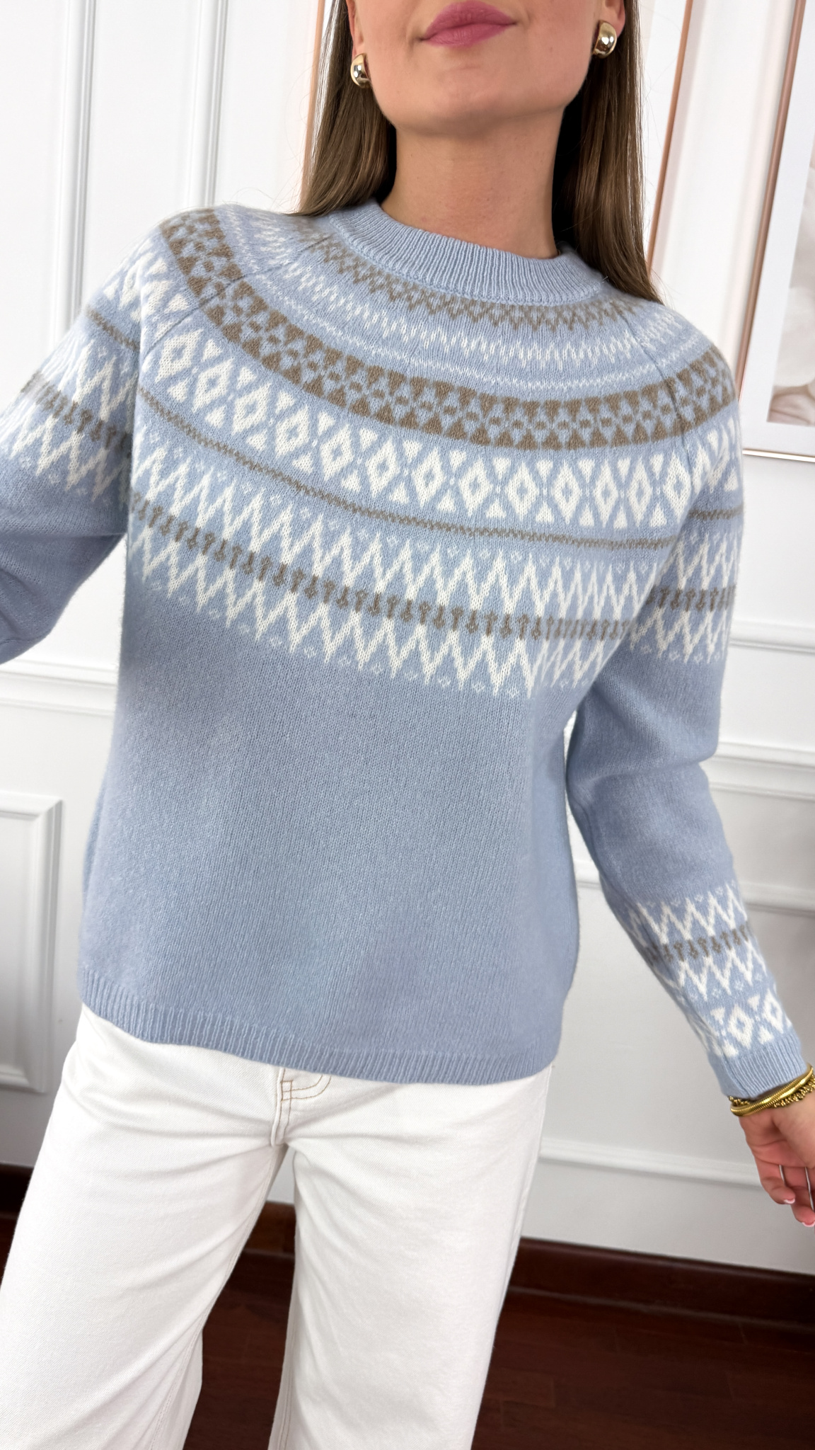 Model sprawdzi się na sylwetkę od XS do XL. Wełniany sweter we wzór norweski na długi rękaw z okrągłym dekoltem. Przeplatanym wzorem przypominającym splot warkocza, który dodaje mu tekstury i stylu. Materiał jest bardzo miękki i niewyczuwalny na skórze.