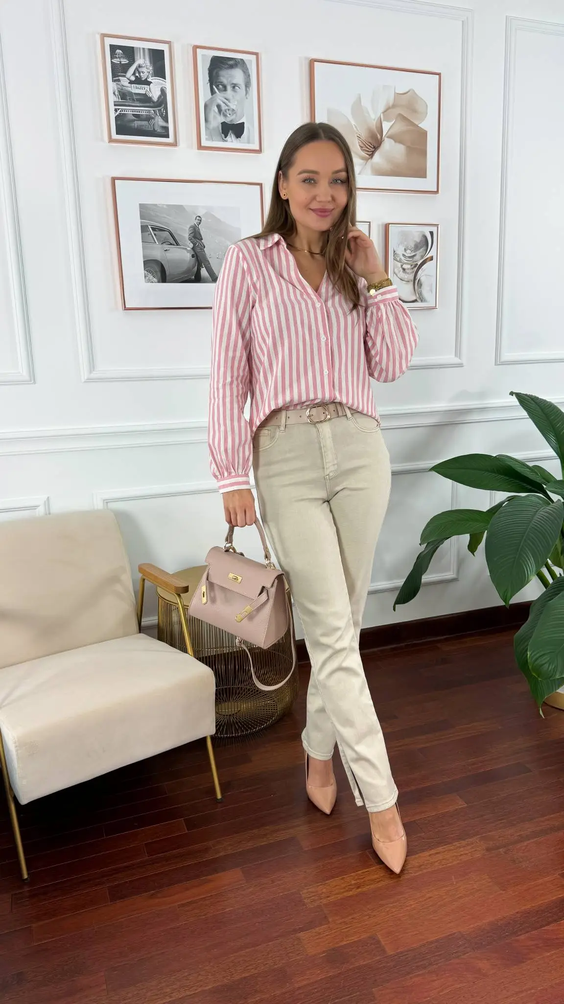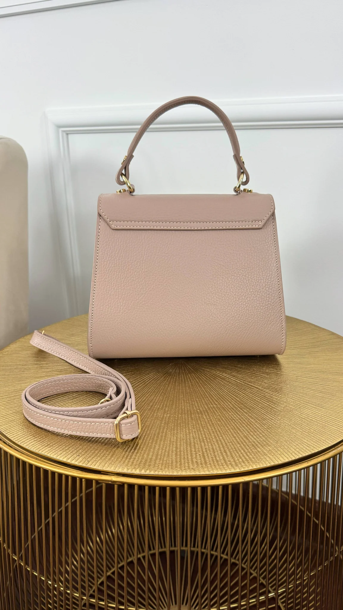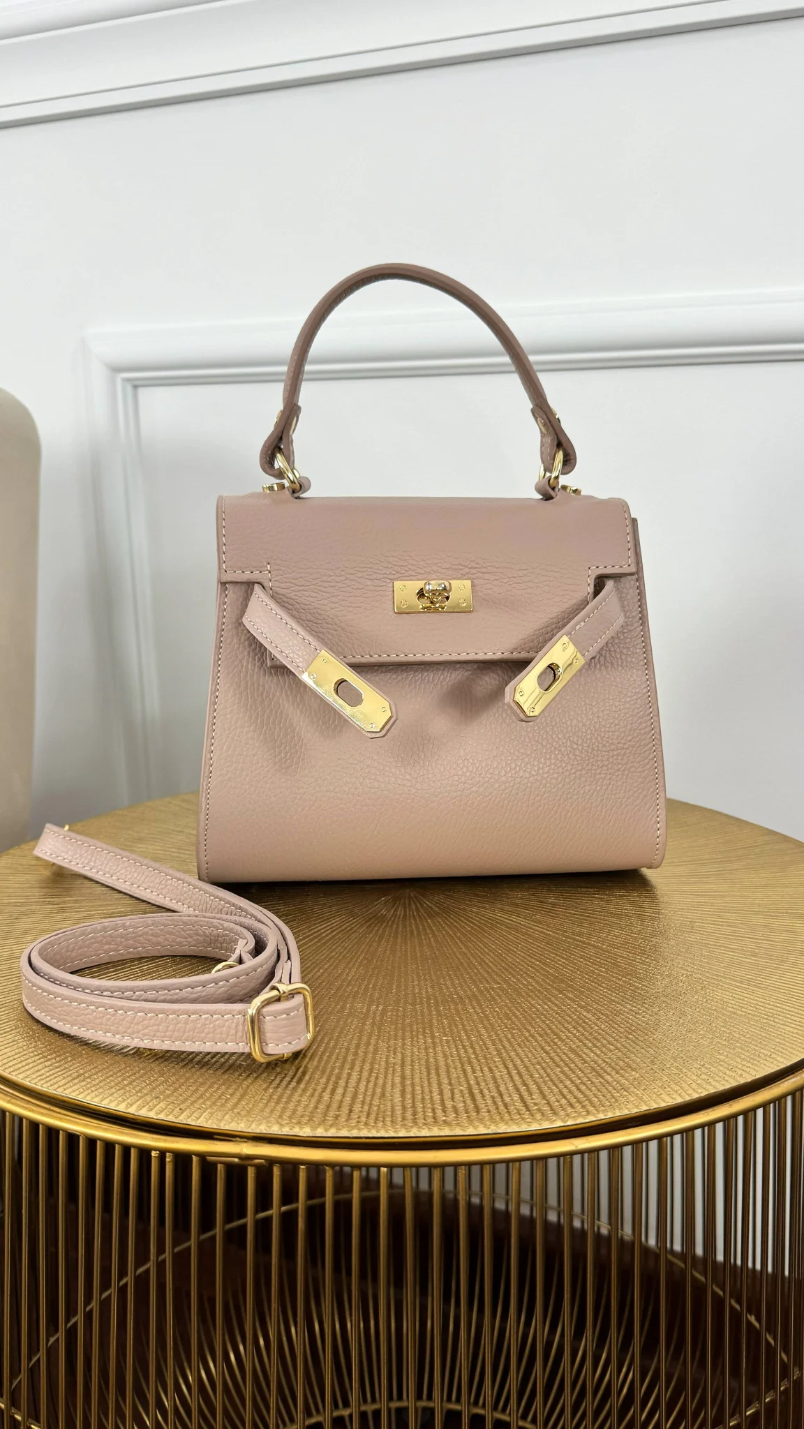 Średniej wielkości torebka z naturalnej skóry. Na zewnątrz model przepinany na pozłacaną klamrą, a w środku zapinany na zamek. Sprzedawana w zestawie z regulowanym paskiem.