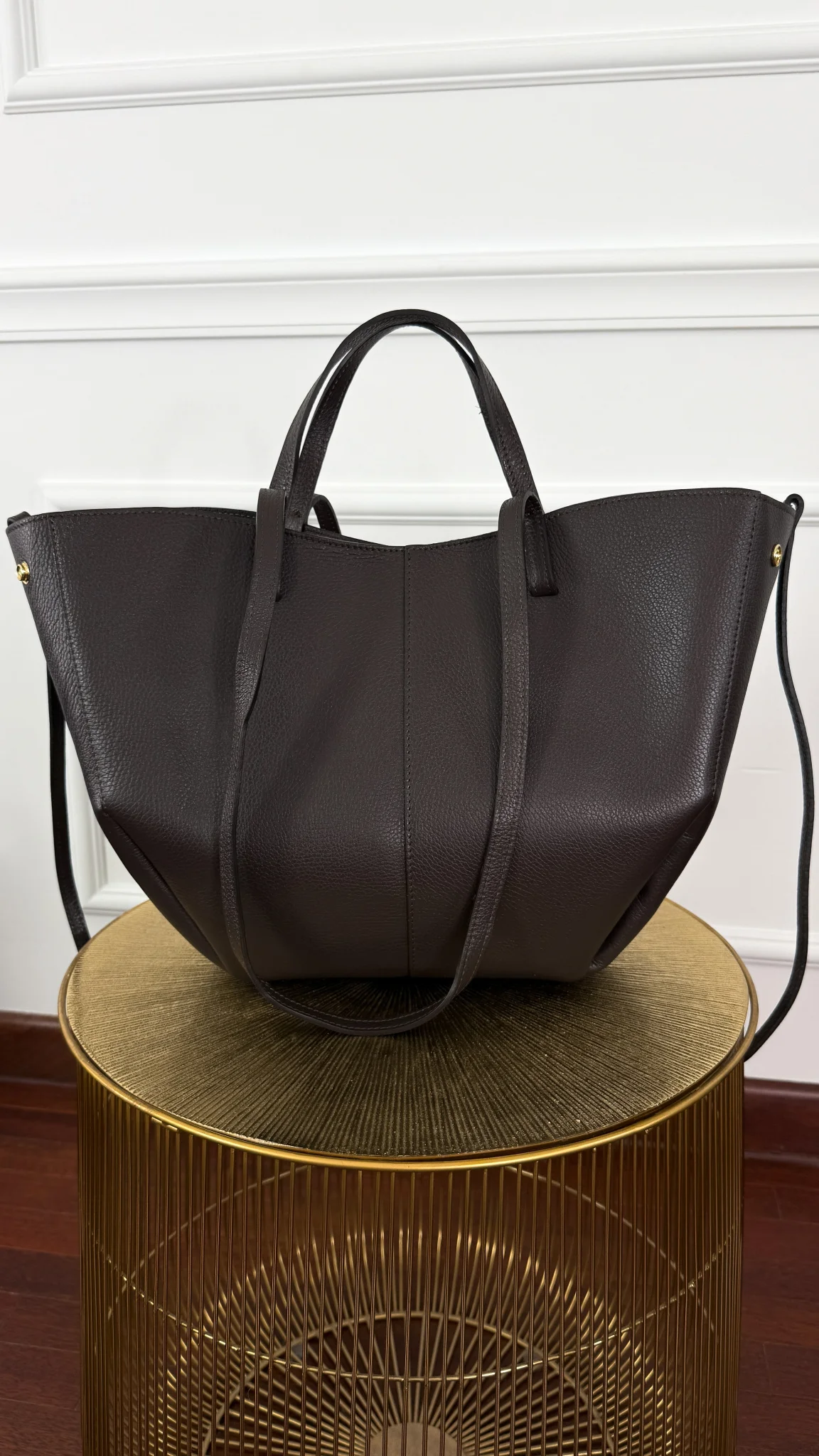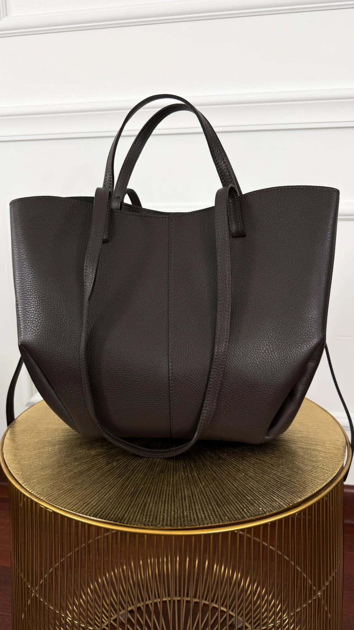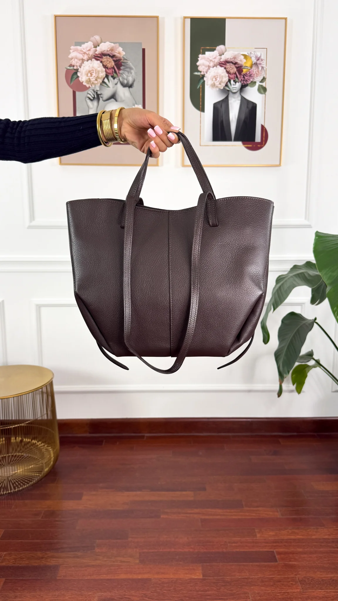 Skórzana torebka z pozłacanymi okuciami zapianana na zamek. Posiada jedną główną komorę, w której znajduje się kosmetyczka. Po bokach występują zatrzaski, za pomocą których można regulować wielkość torebki.
