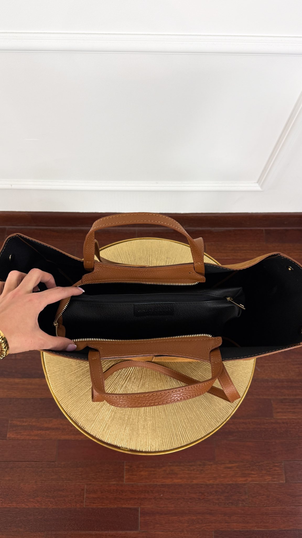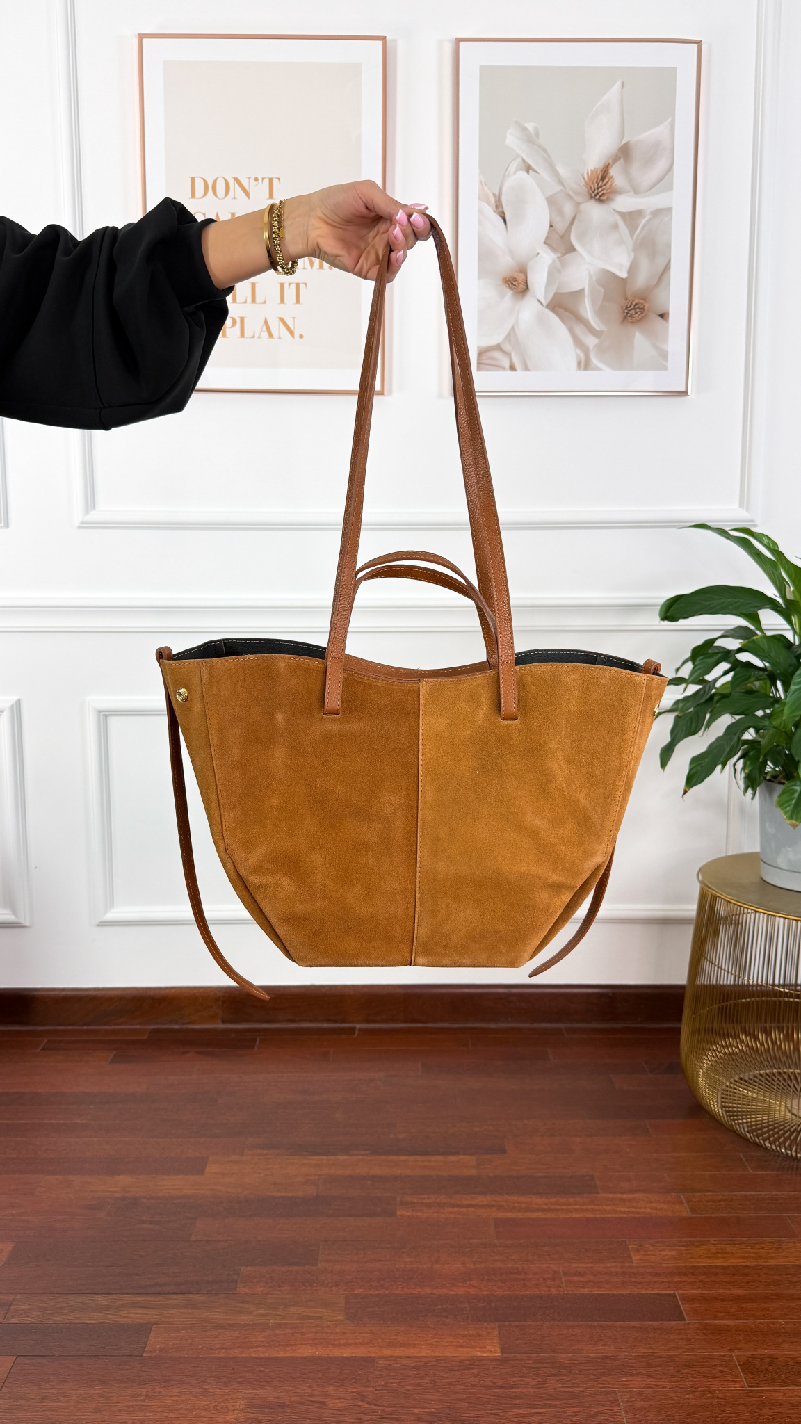 Skórzana zamszowa torebka z pozłacanymi okuciami zapianana na zamek. Posiada jedną główną komorę, w której znajduje się kosmetyczka. Po bokach występują zatrzaski, za pomocą których można regulować wielkość torebki.