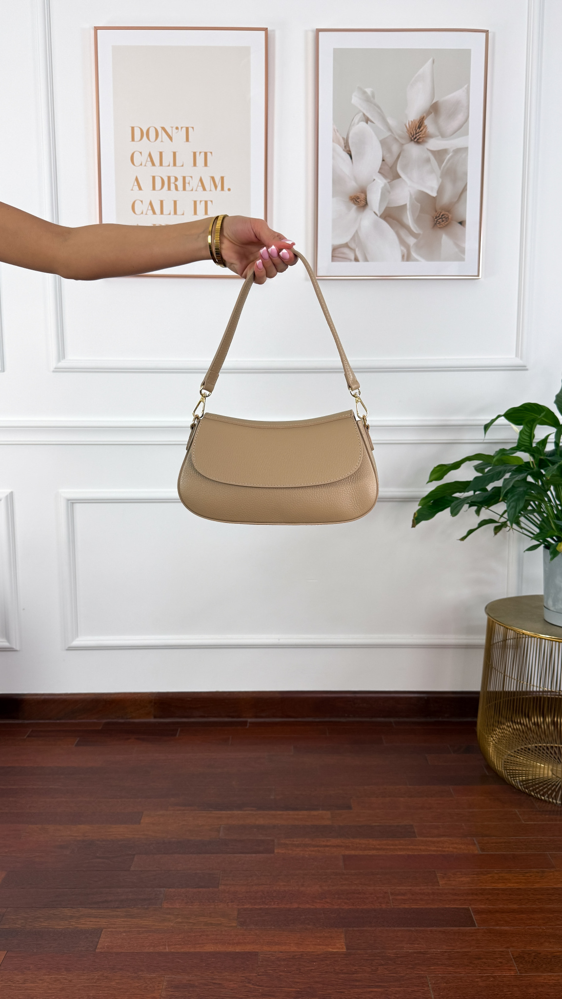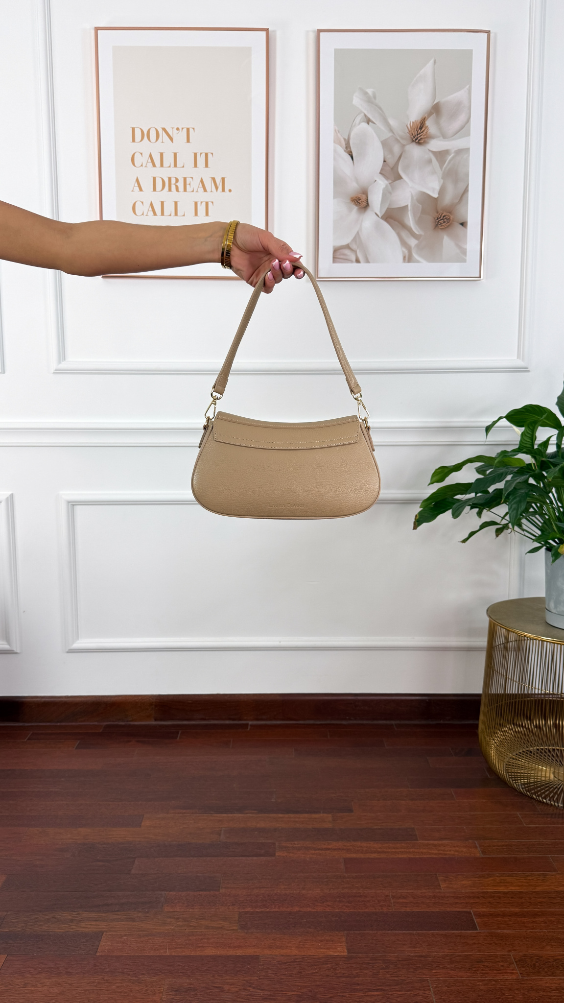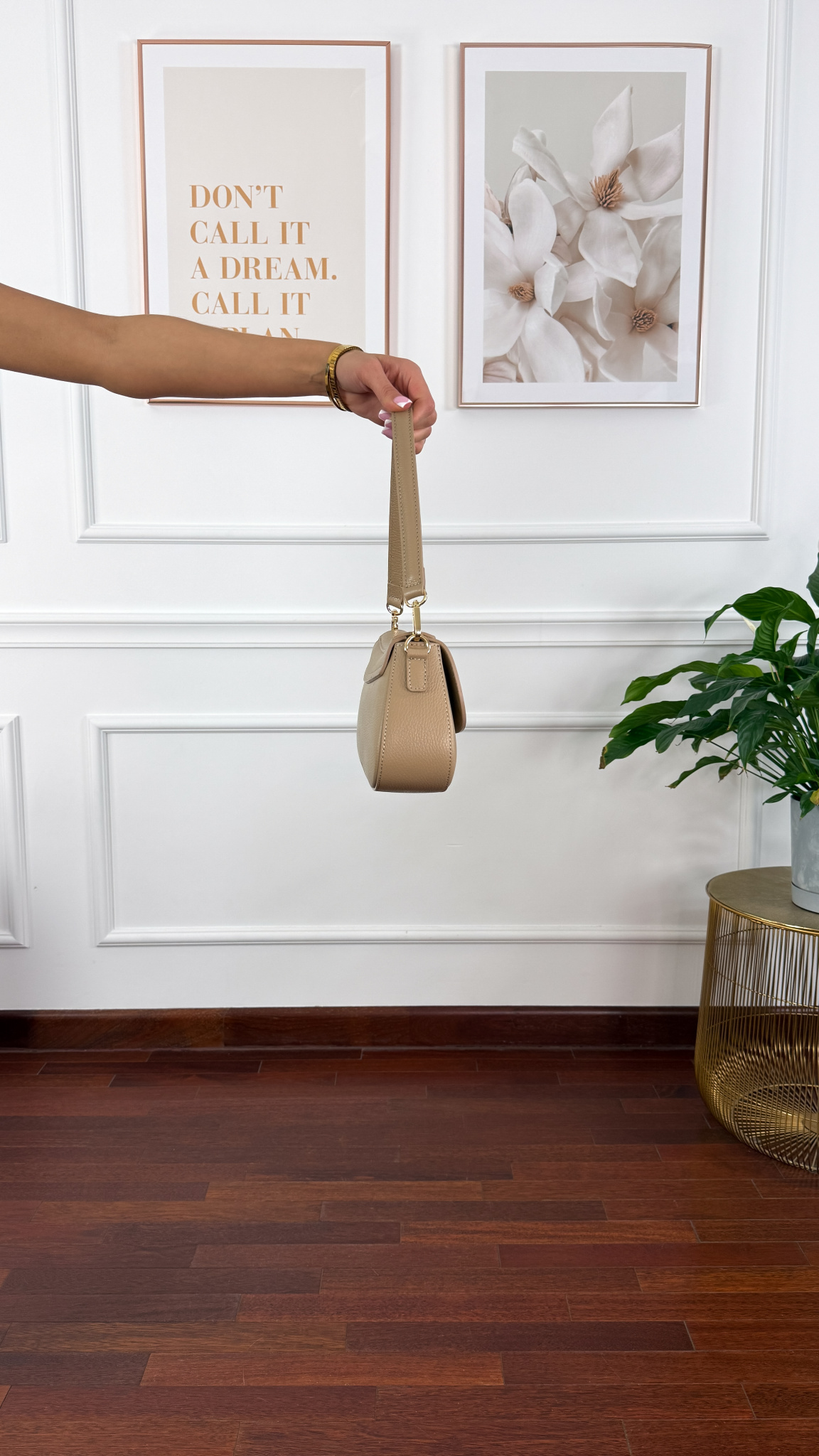 Skórzana torebka z pozłacanymi okuciami zapinana na zatrzask. Posiada jedną główną komorę zapianą na zamek, oraz mała kieszonkę wewnątrz. Mały skórzany pasek do ręki, oraz dodatkowy długi regulowany pasek.